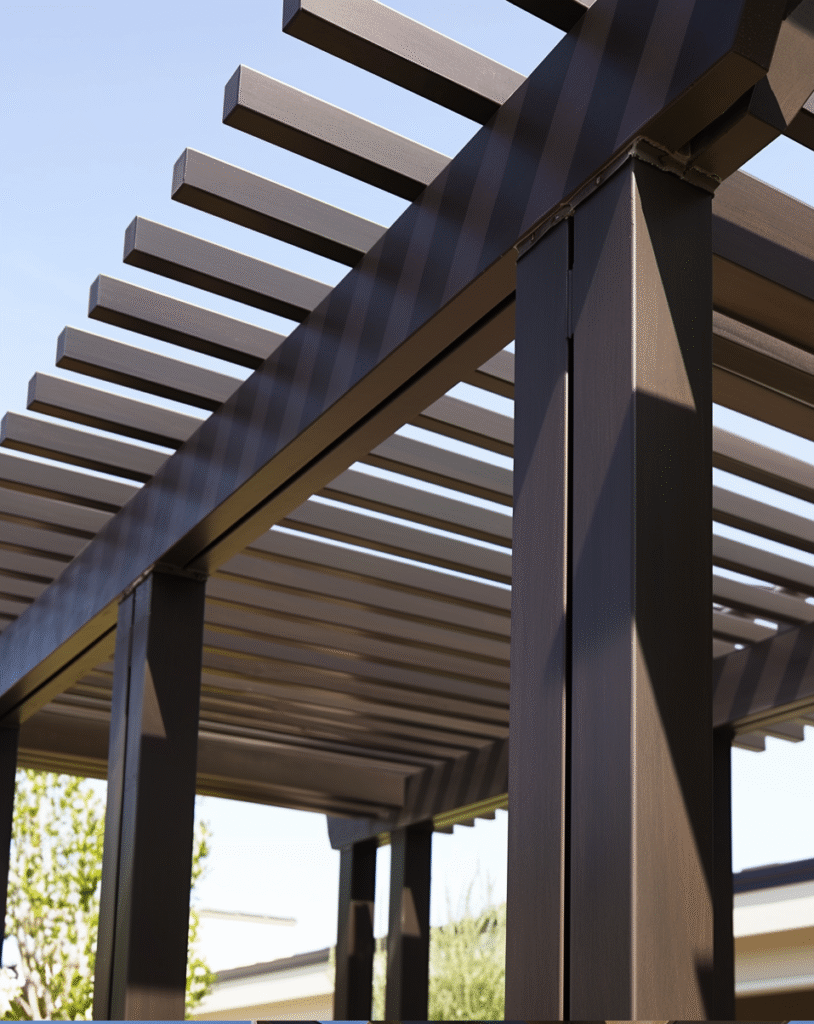 Rafters are precision-cut and spaced for balanced sunlight. Options include cedar for natural warmth or aluminum for low-maintenance durability.